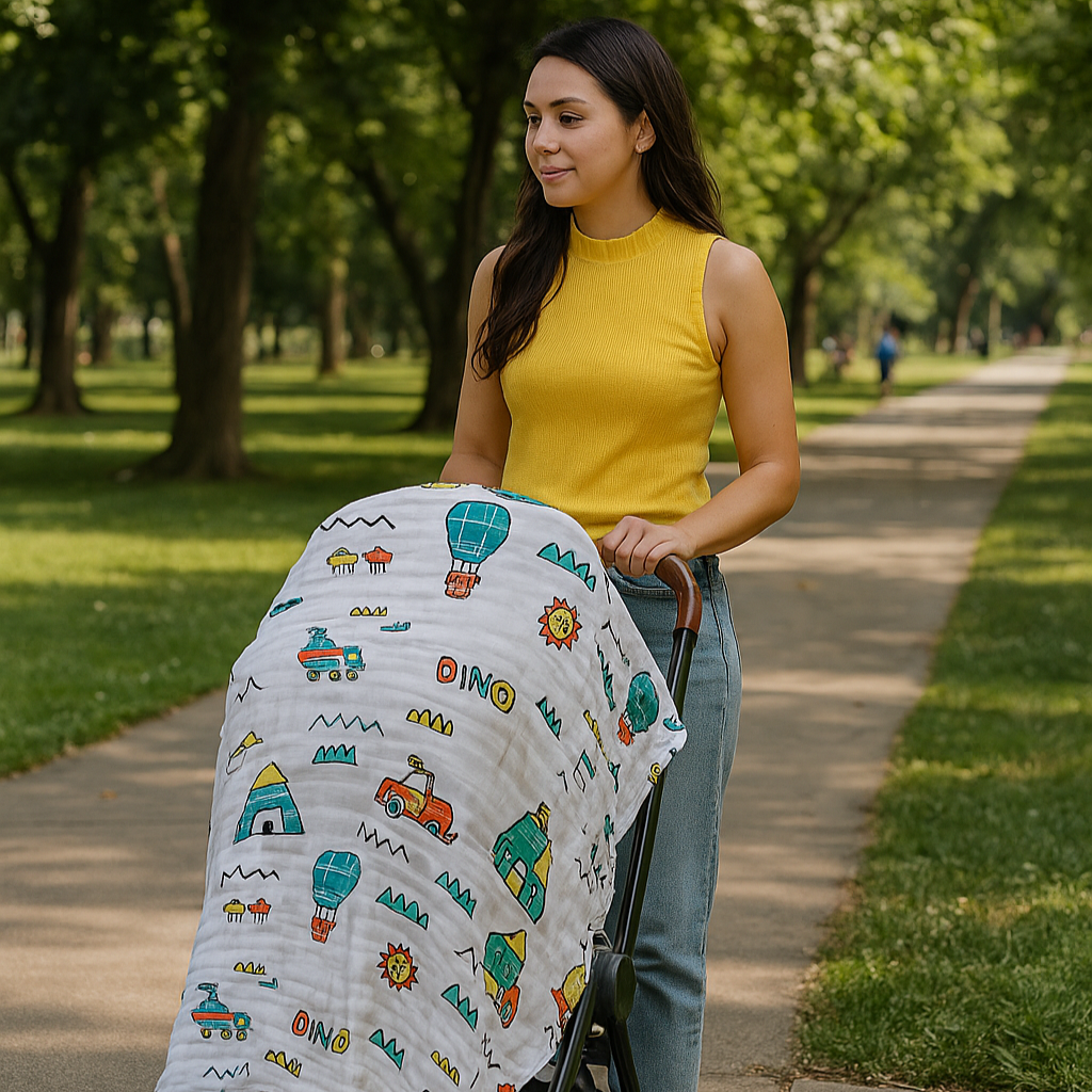 - Swaddle, burp cloth, stroller shade, play mat, nursing cover.